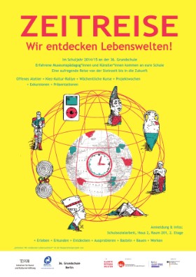 Über den Zeitraum des Schuljahres 2014/2015 begaben sich mehr als 50 Kinder der 36. Grundschule in Berlin Friedrichshain-Kreuzberg auf eine Zeitreise. Entsprechend der Projektidee und inhaltlichen Ausgestaltung von "Technai - Initiative für Kunst und Kulturvermittlung" wurden vielfältige Epochen und Lebensrealitäten erfahrbar, insbesondere durch kreativ-künstlerische Angebote. Parallel konnten sich die SchülerInnen mit ihren eigenen Identitäten und ihrem heutigen Umfeld befassen. Insgesamt wurden verschiedene Angebotsformen kombiniert: Vom offenen Atelier über einen wöchentlichen Kurs bis zur Kiez-Rallye, dazu ganztägige Ferienworkshops sowie Exkursionen zu Galerien und Berliner Museen, wie z.B. das Museum für Vor- und Frühgeschichte, das Vorderasiatische Museum und die Ausstellung "Die Wikinger" im Martin-Gropius-Bau.