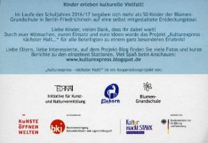 Im Schuljahr 2016/17 findet an der Blumengrundschule Berlin - Friedrichshain das Projekt „Kulturexpress – nächster Halt…“ statt.